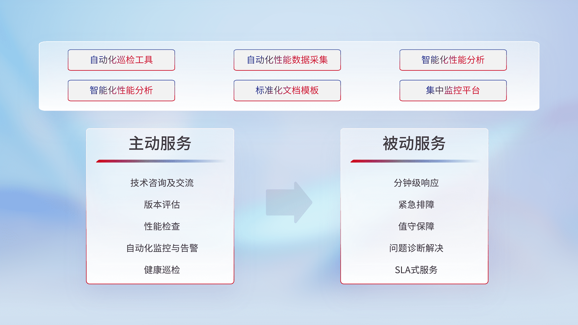 智能化工具和标准化文档,,保障服务质量,,,,提供主动服务(包含技术咨询、、、版本评估、、、、性能检查、、自动化监控与告警、、健康巡检)和被动服务包含(分钟级响应、、、紧急排障、、、值守保障、、问题诊断解决、、SLA服务)。。。