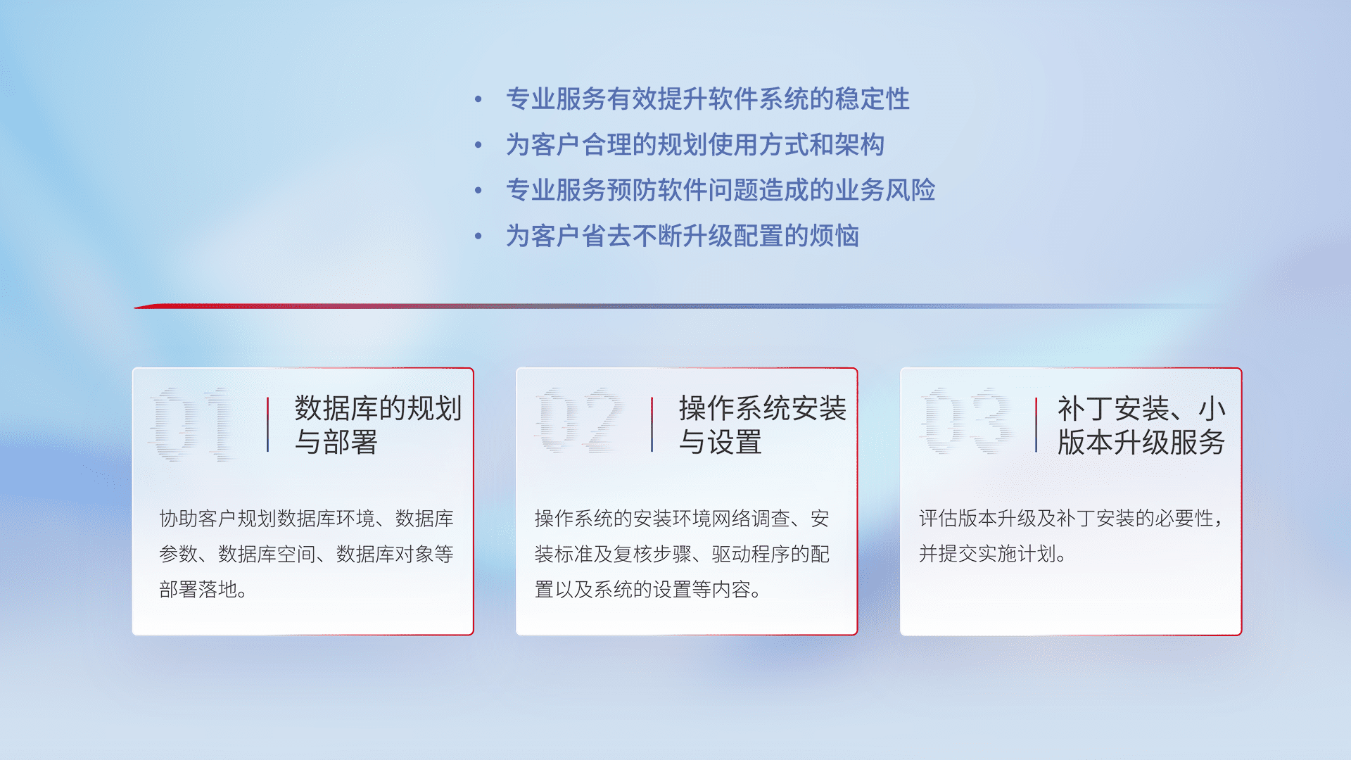 为客户提供软件规模升级、、快速部署、、、、按需配置的专业服务,,,从数据库的规划与部署到操作系统的安装与设置,,再到补丁安装和小版本升级提供支持。。。