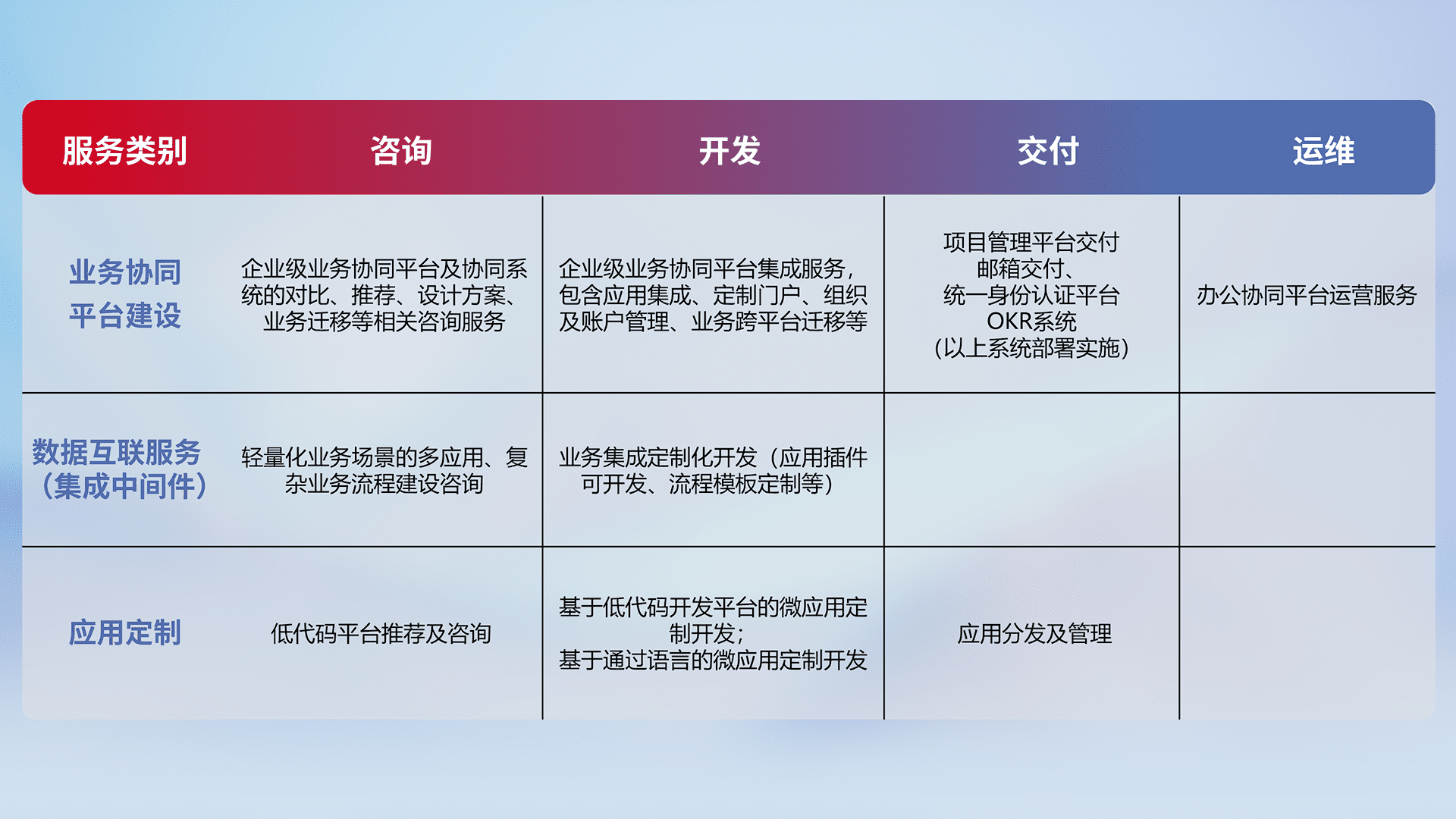 针对钉钉、、、企微、、、、IDaas等平台级产品提供产品的规划、、、、方案、、、交付、、定制化开发等服务,,,,实现如统一协同办公、、、、智能客户服务、、混合会议管理、、、、智能数据查询、、、、等业务场景,,,,实现数字化转型。。